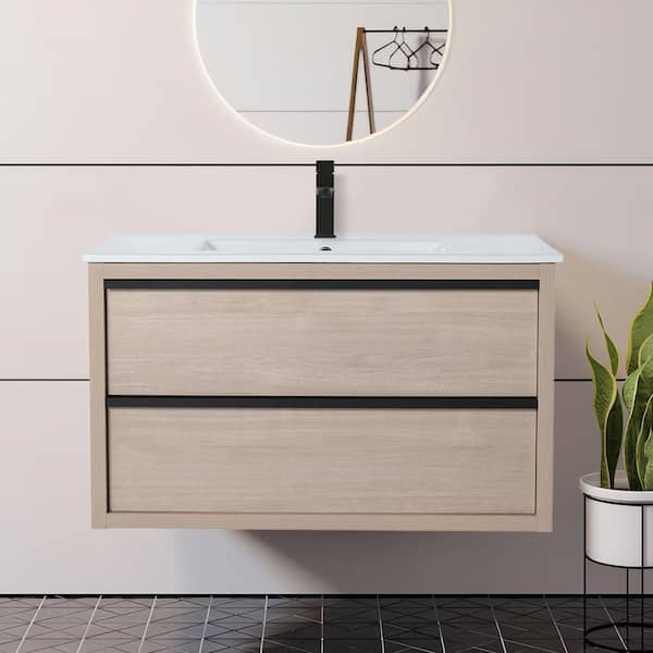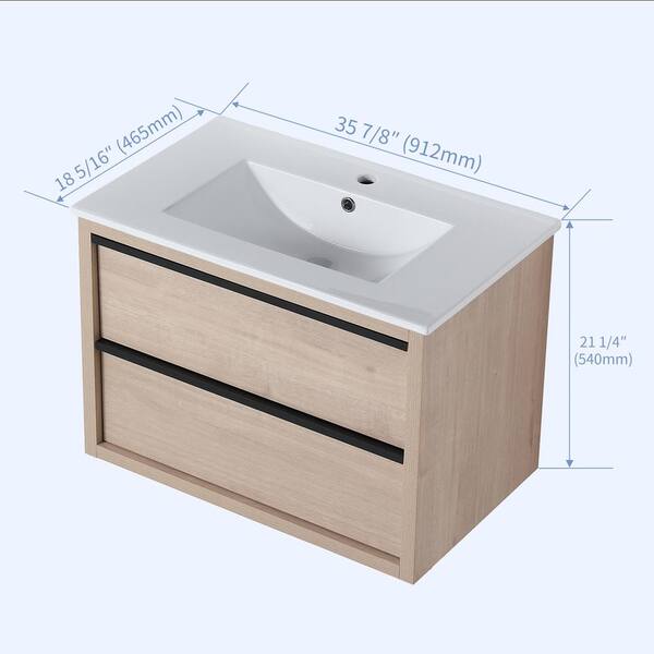 Modern 36 in. W x18.31 in. D x 21.25 in. D D H Wall Hung Bath Vanity in Plain Light Oak with White Ceramic Top