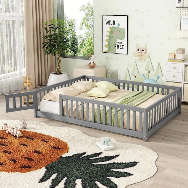 Gray Full Size Wood Floor Bed Frame with Safety Guardrails and Door Low Platform Bed with Bed Slats for Kids