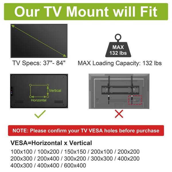 TV Wall Mount for 37 in. - 84 in. Flat Screen TVs, up to 132 lbs. and 6 ft HDMI.