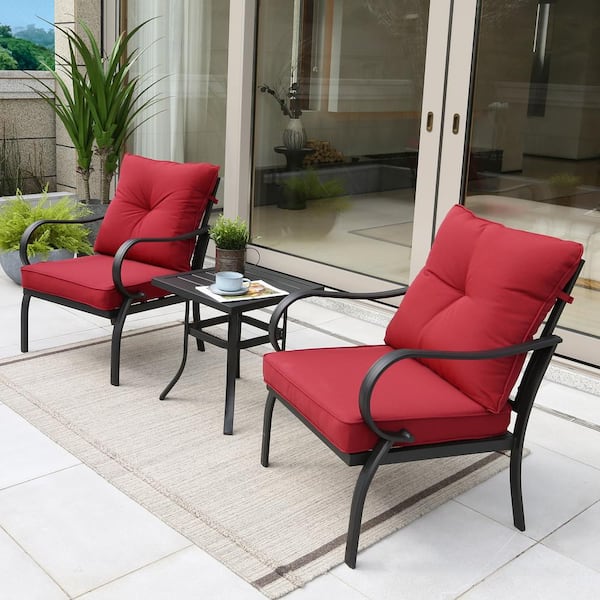 UV Protected Black 3-piece Metal Outdoor Patio Conversation Set with Red Cushions