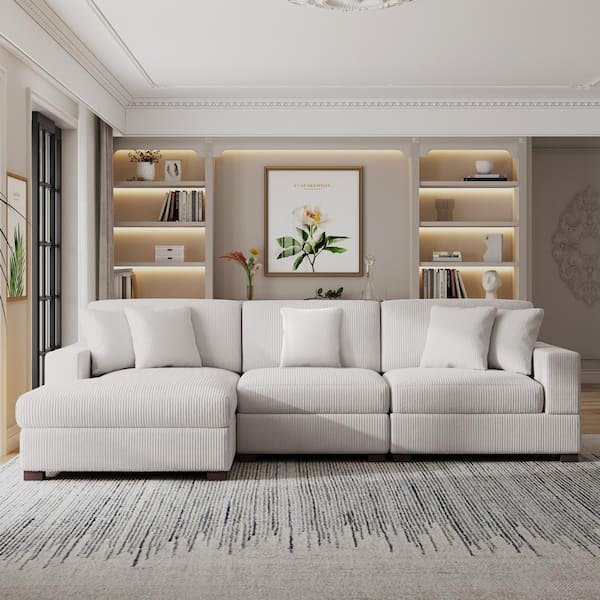 118 in. Square Arm 3-Piece Corduroy Upholstered L-Shaped Sectional Sofa in. Beige with Pillows