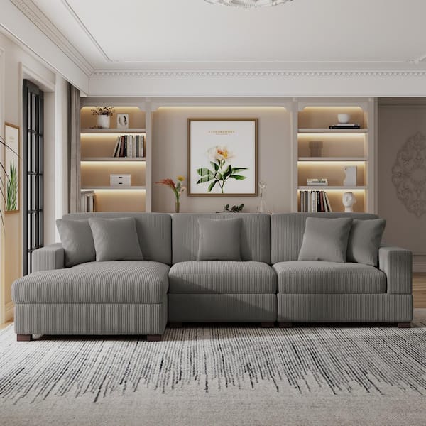 118 in. Square Arm 3-Piece Corduroy Upholstered L-Shaped Sectional Sofa in. Light Gray with Pillows