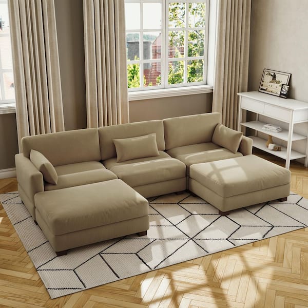 123 in. Square Arm 5-Piece Corduroy Upholstered U-Shaped Sectional Sofa in Camel