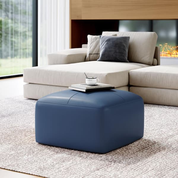 22 in. Wide Mid-Century Navy Blue Genuine Leather Square Ottoman(Set of 1)