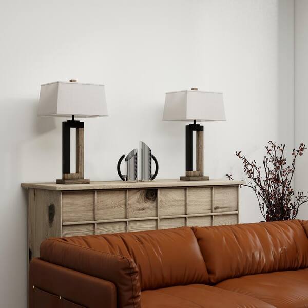 25.8 in. Black Metal and Gray Wood Base USB Table Lamp Set with Off-White Fabric Shade and Cable (Set of 2)