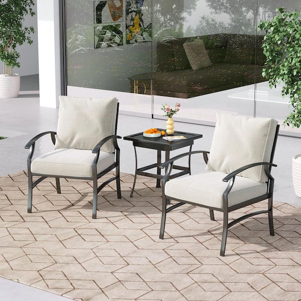 3-Piece Metal Outdoor Armchair Patio Conversation Set with Beige Cushions