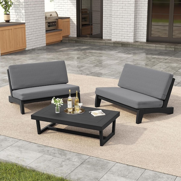 4-Seat 3-Piece Teak Black Outdoor Loveseat Conversation Set With Removable Gray Cushions and Coffee table