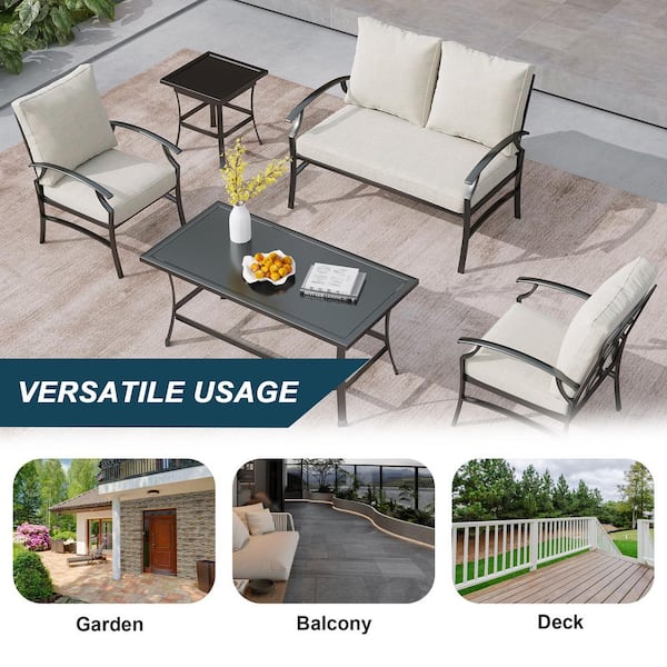 5-Piece Black Metal Frame Outdoor Patio Furniture Set with Armchairs, Beige Loveseat and Coffee Tables