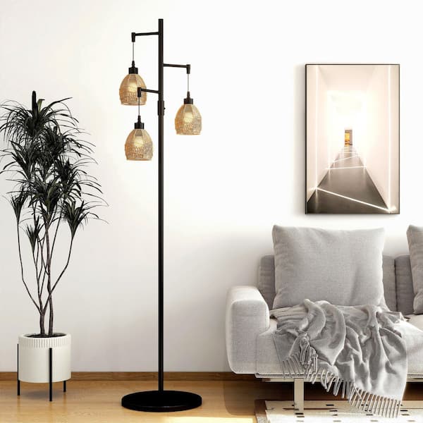 65.05 in. Brown Boho Rattan Dimmable Tree Standing Floor Lamps with 3 LED Edison Bulbs