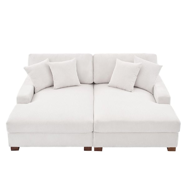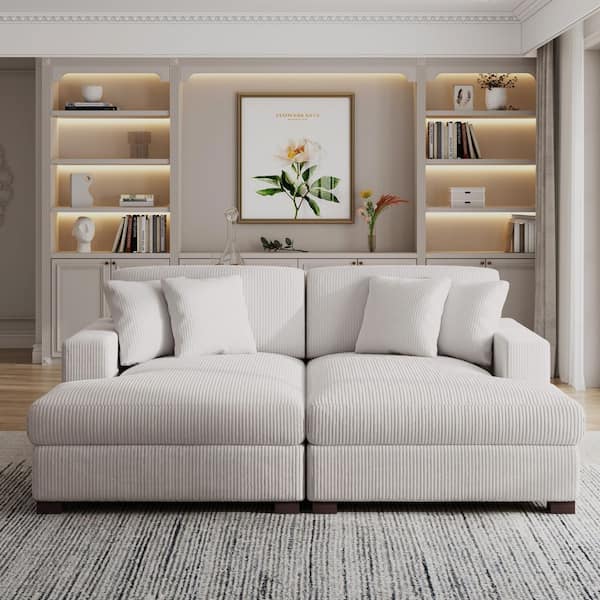 83 in. Square Arm Beige Corduroy Fabric Upholstered Sectional Sofa With Four Pillows And Wood Leg
