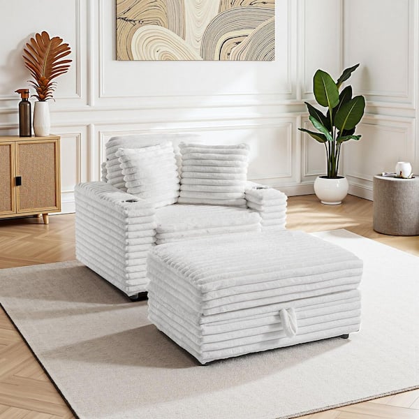 Beige Faux Rabbit Fur Polyester Fabric Upholstered Accent Arm Chair with Storage Ottoman and Plastic Legs (Set of 1)