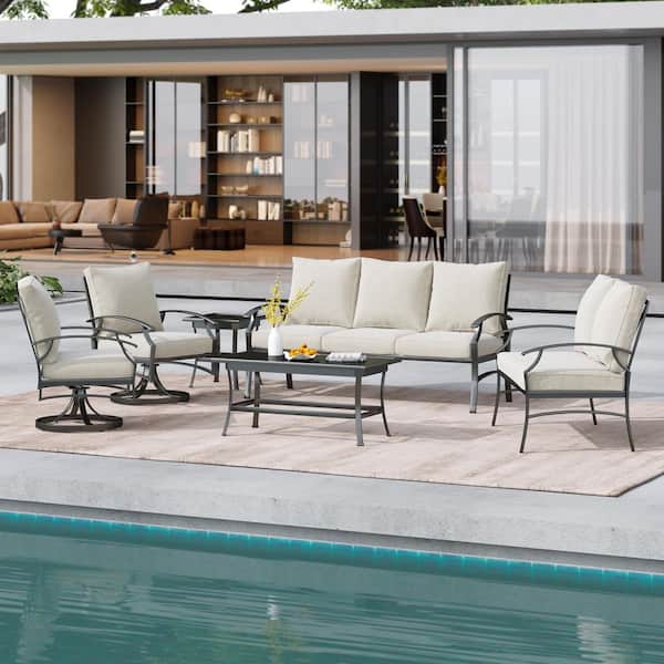 Black 6-Piece Metal Patio Conversation Sofa and Loveseat and Single Chairs Set and Coffee Table With Beige Cushions