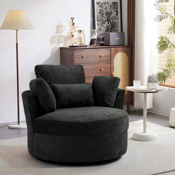 Black Cotton Upholstered 360° Swivel Accent Barrel Chair with Corduroy Pillows (Set of 1)