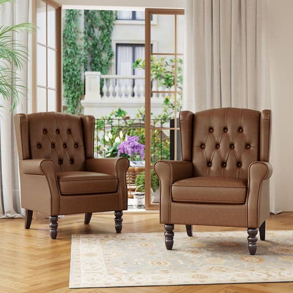 Brown PU Leather Button Tufted Design Accent Arm Chair (Set of 2)