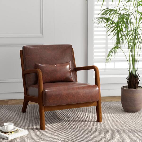 Mid-Century Coffee Faux Leather Upholstered Accent Arm Chair with Light Walnut Color Rubber Wood Frame (Set of 1)