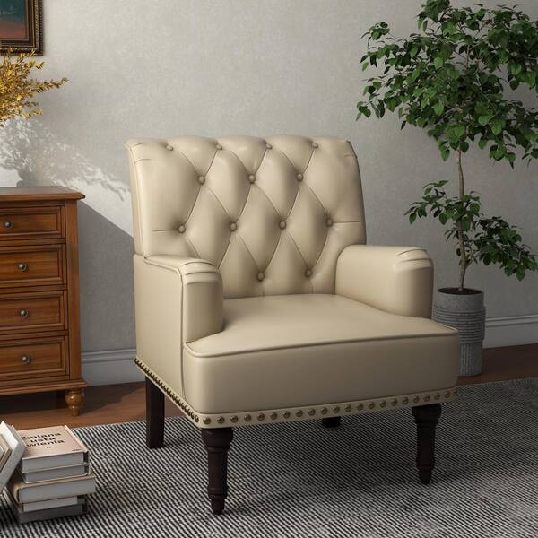 Mid-Century Modern Solid Wood Legs Beige PU Leather Button Upholstered Accent Armchair With Nailhead Trim