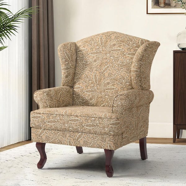 Mid-Century Retro Style Paisley Brown Linen Upholstered Wingback Arm Chair with Wooden Legs (Set of 1)