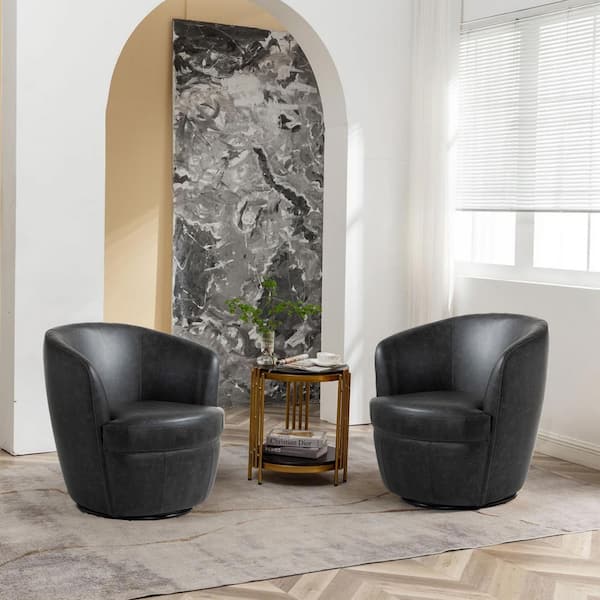 Minimalistic Black PU Leather Swivel Barrel Arm Chair with Metal Base (Set of 2)