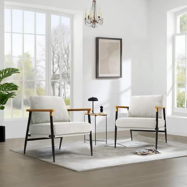 Modern Beige Cotton Fabric Upholstered Arm Chair with Metal Legs(Set of 2)