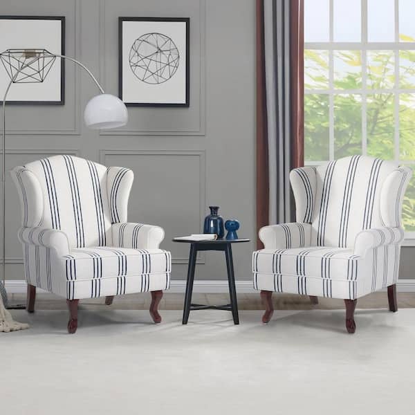 Stripe Navy Linen Wood Legs Upholstered Accent Arm Chair with Wingback (Set of 2)