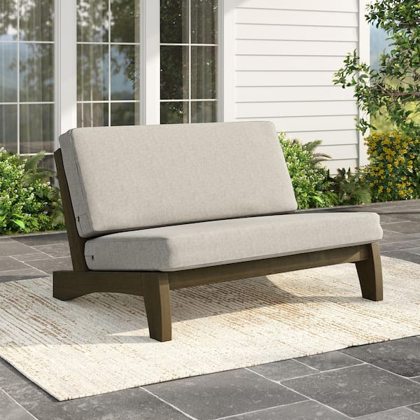 Teak Color Solid Wood Frame Outdoor Loveseat Sofa with Removable Light Camel Cushions