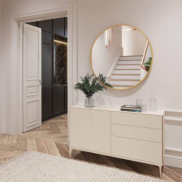 32 in. W x 32 in. H Gold Brushed Aluminum Alloy Framed Round Mirror Anti Fog