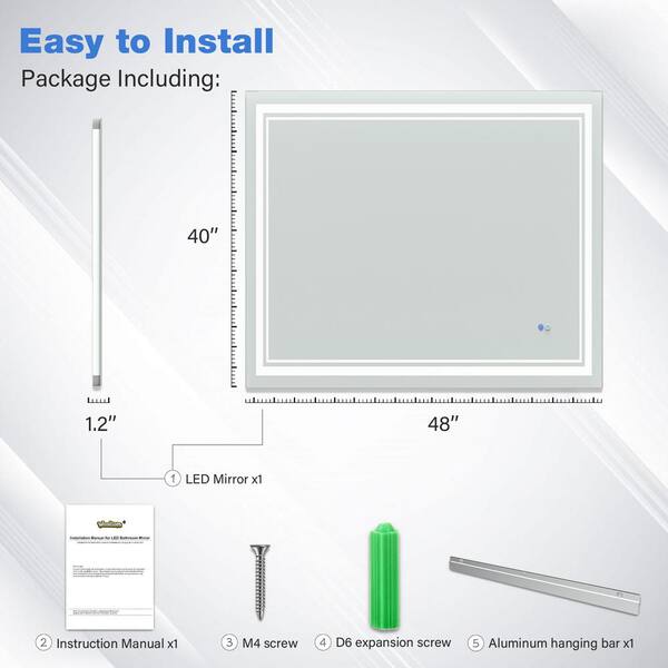 48 in. W x 40 in. H Rectangular Frameless LED Wall Mount Anti-Fog Dimmable Modern Decorative Bathroom Vanity Mirror