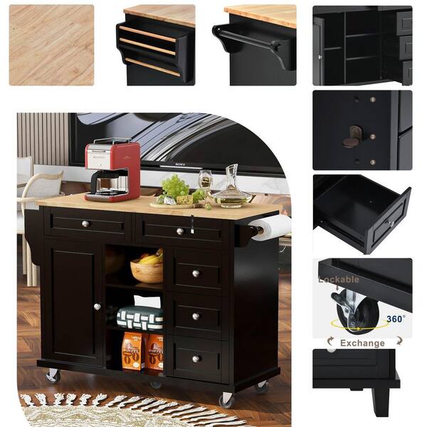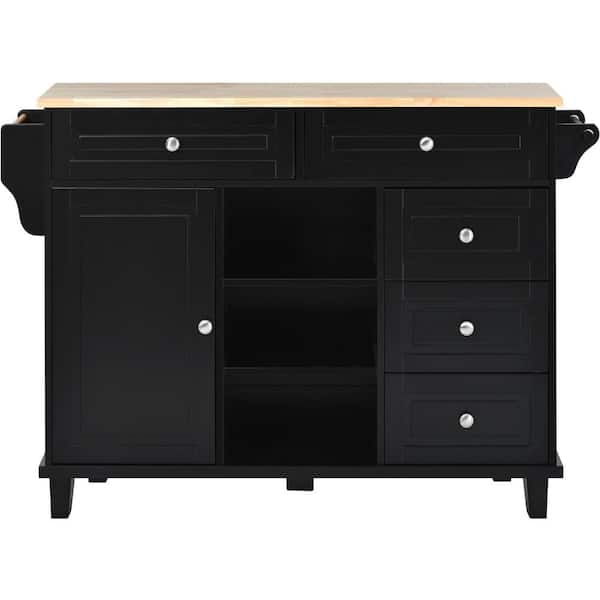Chiane Black Kitchen Island with Rubber Wood Desktop