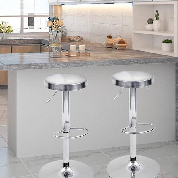 Swivel Adjustable Height Barstool with Footrest, Stainless Steel Round Top 32 in. Height Barstools, Set of 2-Silver