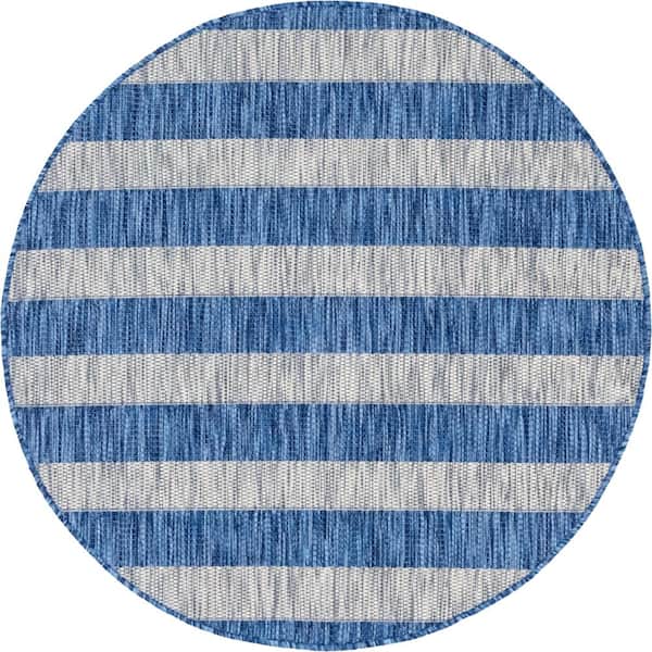 Outdoor Distressed Stripe Azure Blue 4 ft. Round Area Rug