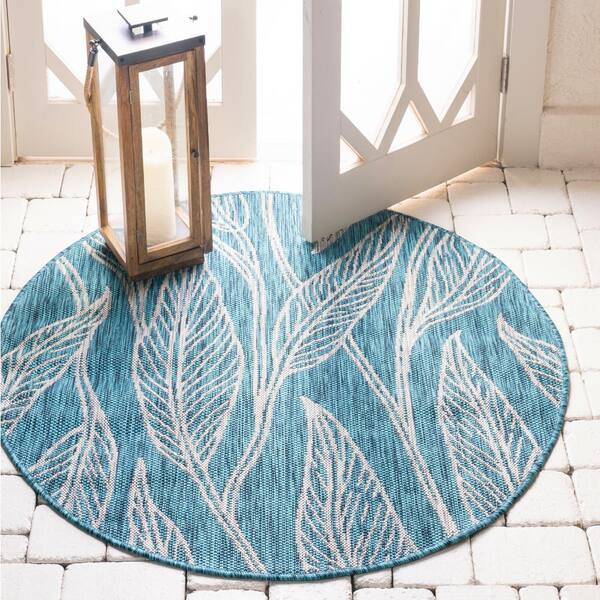 Outdoor Leaf Teal 4 ft. Round Area Rug