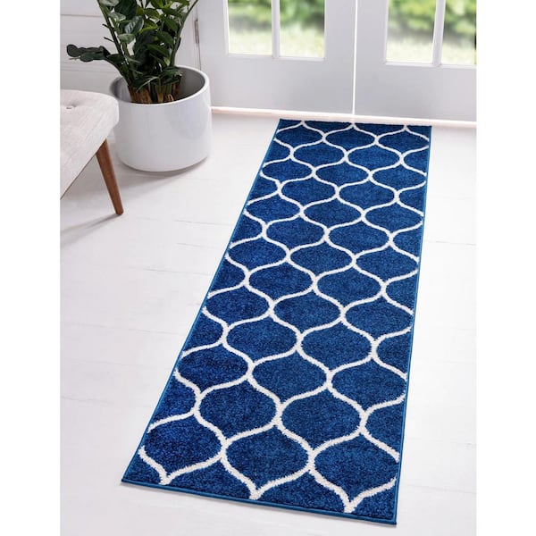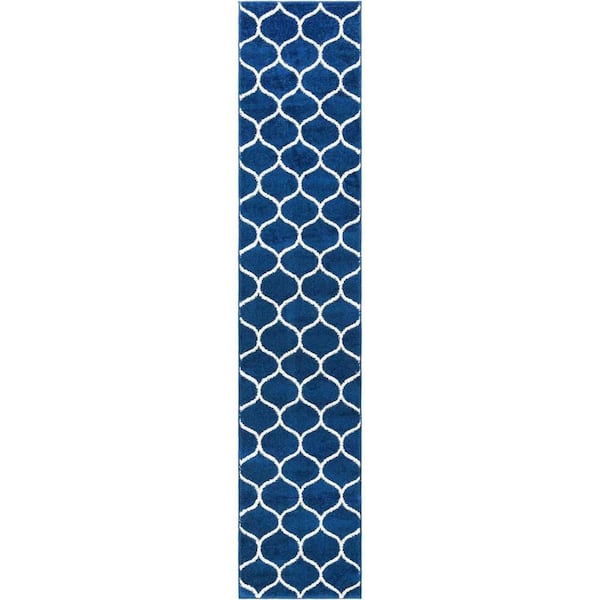 Trellis Frieze Collection Area Rug - Rounded (2 ft. x 10 ft. Runner Navy Blue/Ivory)