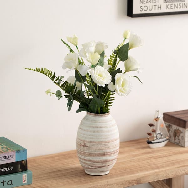 8 in. Whitewashed Distressed Ceramic Farmhouse Vase, Rustic Vintage for Home Decor Countertop Shelf White Shape Round