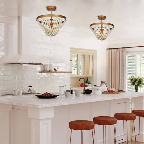 13.8 in. 2-Light Antique Gold Semi-Flush Mount Light with Weathered White Wood Beads