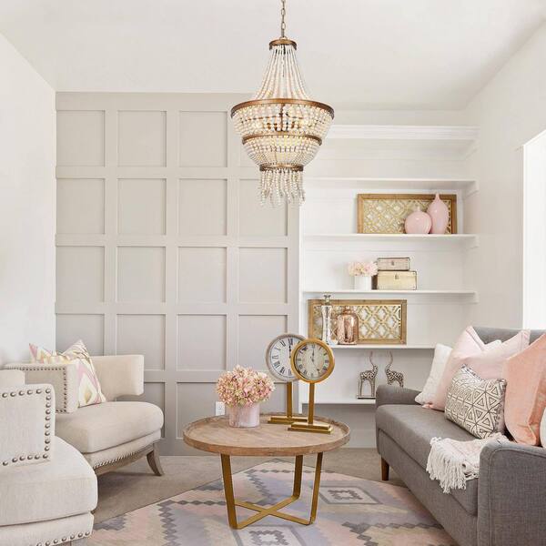 3-Light Antique Gold Drum Chandelier with Weathered White Wood Beads