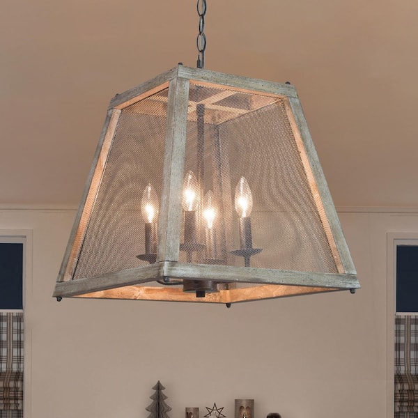 4-Light Gray Modern Industrial Wood Cage Lantern Chandelier for Foyer