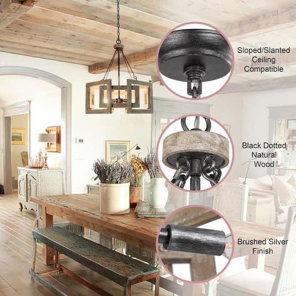 Wood Chandelier, Farmhouse 4-Light Wood Island Drum Rustic Metal Chandelier Dining Room Ceiling Light