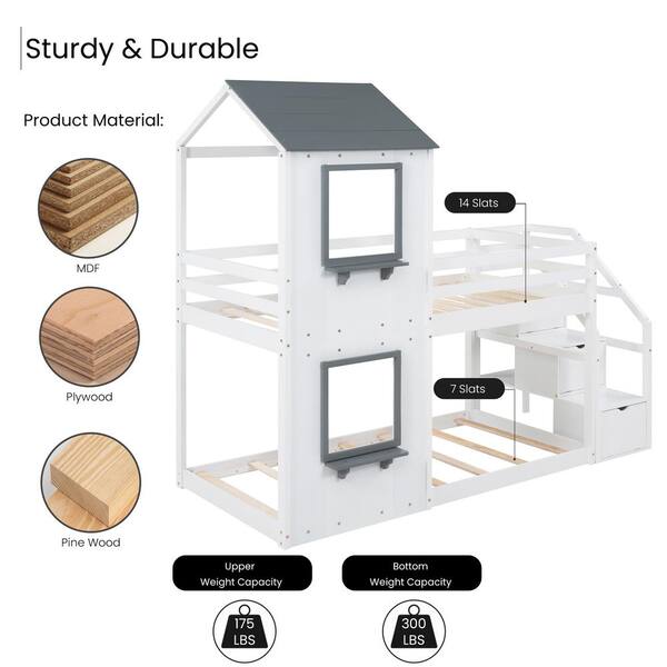 Kailey White and Gray Twin Over Twin Bunk Bed with Storage Stairs