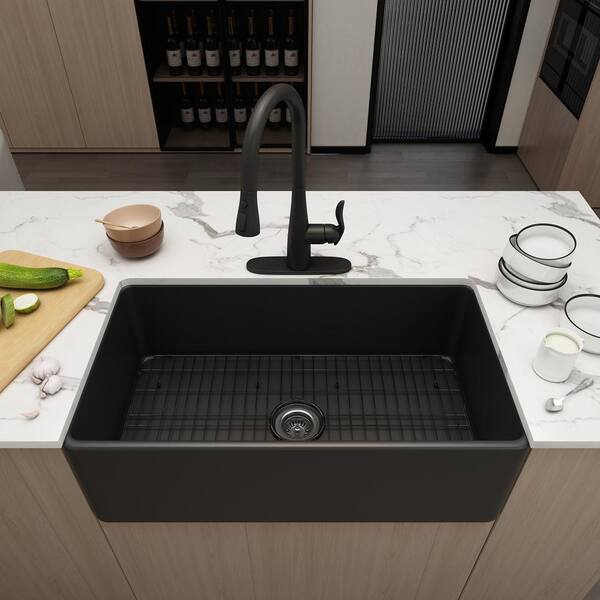 33 in. Undermount Farmhouse Single Bowl Black Fine Fireclay Double-Sided Kitchen Sink with Faucet and Accessories