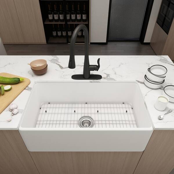 33 in. Undermount Farmhouse Single Bowl White Fine Fireclay Double-Sided Kitchen Sink with Faucet and Accessories