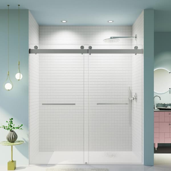 72 in. W x 76 in. H Double Sliding Frameless Shower Door in Brushed Nickel with Soft-closing and 3/8 in. Thick Glass