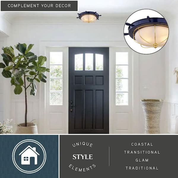 Orleans 15 in. W Navy Blue and Matte Gold Coastal Ship Wheel Flush Mount Indoor Outdoor Ceiling Light Fixture