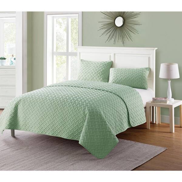 Nina 3 Piece Green Embossed Basketweave Microfiber Quilt Set