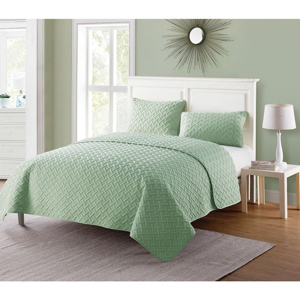 Nina Embossed 3 piece Green Basketweave Microfiber King Quilt Set