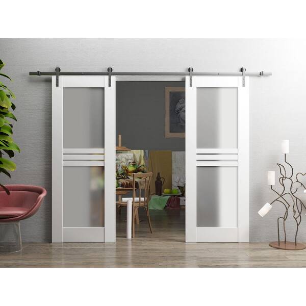 18 in. x 80 in. 2 Panel Frosted Glass White Solid MDF Sliding Barn Door with Hardware Kit
