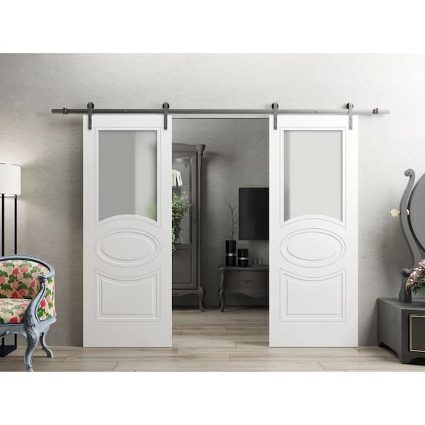 24 in. x 96 in. 2 Panel Frosted Glass Painted White Solid MDF Sliding Barn Door with Hardware Kit