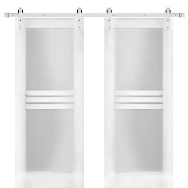 42 in. x 80 in. 2 Panel Frosted Glass White Solid Wood Sliding Barn Door with Hardware Kit