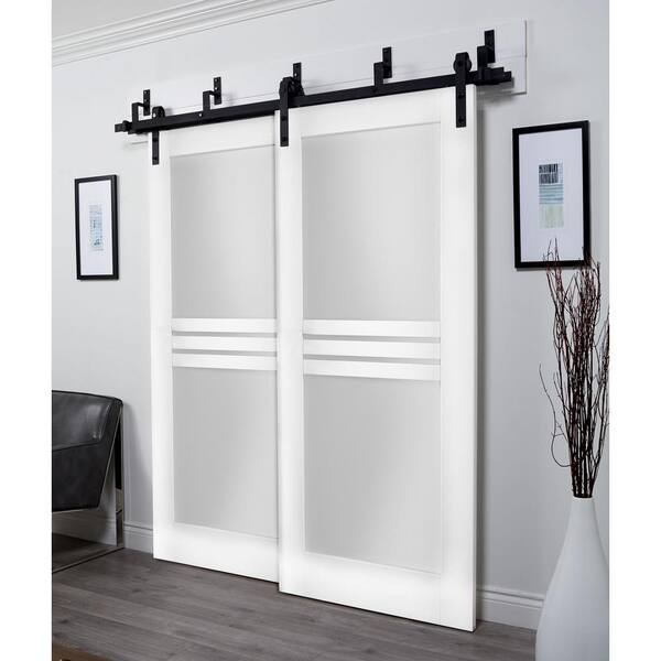 48 in. x 96 in. 2 Panel Frosted Glass White Solid MDF Sliding Barn Door with Hardware Kit