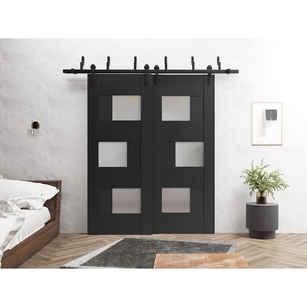 60 in. x 96 in. 2 Panel Frosted Glass Black Matte Wood Sliding Barn Door with Hardware Kit