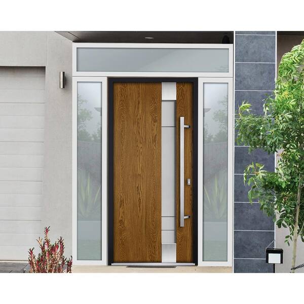 68 in. x 96 in. Left-Hand/Inswing 2 Sidelight Transom Frosted Glass Oak Steel Prehung Front Door with Hardware